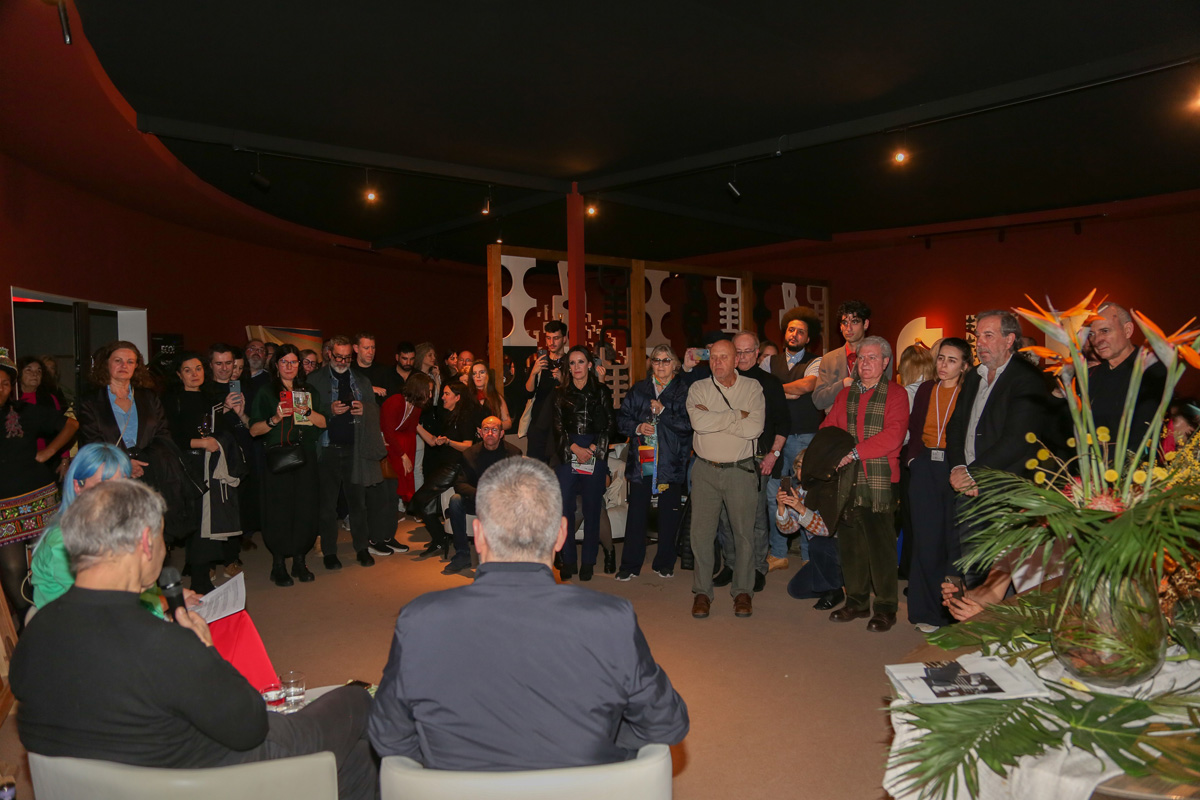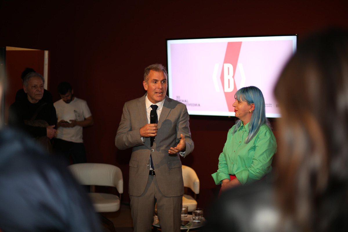 La parte central del acto fue una conversación de la artista escénica pontevedresa Marta Pazos con el comisario general de la bienal, Antón Castro, y con el responsable del programa de artes vivas, Iñaki Martínez Antelo. En su presentación, Pazos puso en valor que la bienal más antigua de España vuelva "con una propuesta ambiciosa y necesaria: en un mundo fracturado por conflictos, nos invita a un ejercicio colectivo de reflexión, empatía e imaginación a través del arte". Por su parte, Antón Castro explicó cómo ese objetivo marcado desde el lema de esta edición, "Volver a ser humanos. Ante el dolor de los demás", se hace explícito en una selección de artistas y obras que abordan la cuestión de los conflictos bélicos y la necesidad de una respuesta de esperanza. Muchos de las y los artistas que estarán en la bienal tienen obra expuesta en esta edición de ARCO, y varios asistieron a la presentación, como Manuel Casimiro, Almudena Fernández Fariña, Carmen Hermo, Norberto Olmedo, Dagoberto Rodríguez o Idoia Cuesta. También acudió Carlos Rosón, cuya Fundación RAC será una de las sedes de esta bienal.